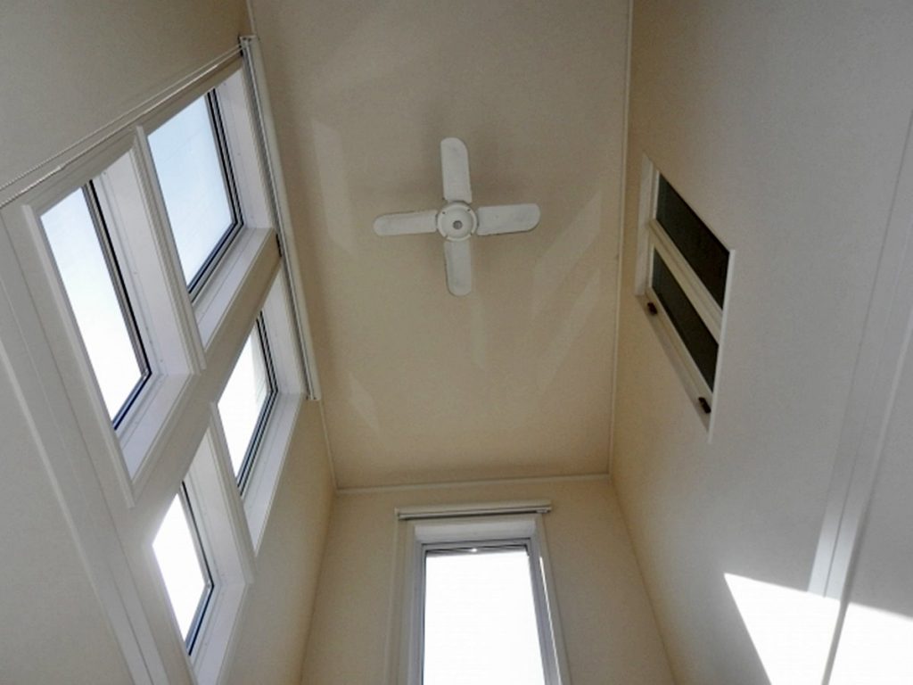 天井にシーリングファンはついていますが、それでも効きが悪い。